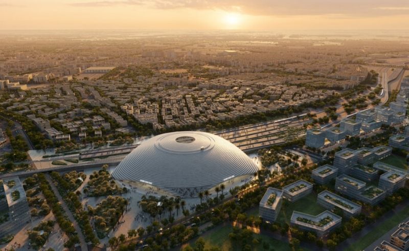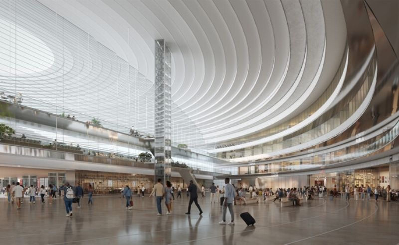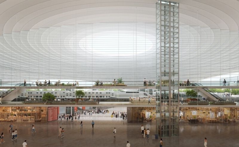 At its core, the design is defined by a monumental vaulted roof, a single unifying gesture that gathers all the station’s functions beneath one continuous form. The roof’s spherical geometry lends the project a spatial balance — a structure that gives equal importance to every direction and every surrounding neighbourhood. Beneath this immense canopy, circulation, light, and activity unfold in what OUALALOU+CHOI describe as a “functional and poetic choreography”, transforming the act of travel into an experience of architectural movement.