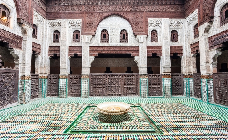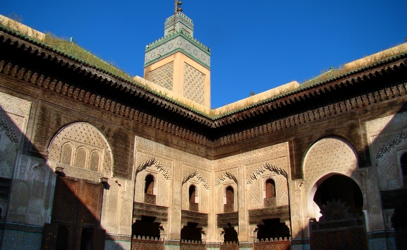 Set within the dense fabric of Fez, the Bou Inania Madrasa (1350–1355) represents the height of Marinid craftsmanship. Designed as both a college and a congregational mosque, its symmetrical plan organises dormitories, domed halls, and a prayer chamber around a marble courtyard. The façade integrates a minaret and a once-operational water clock—an urban gesture linking time, learning, and devotion.