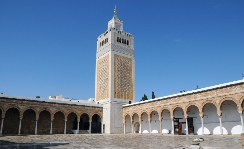 Anchoring the medina of Tunis, the Zaytuna Mosque and Madrasa trace their origins to the 8th century, rebuilt under the Aghlabids in the 9th. Its vast 5,400-square-metre plan centres on a courtyard (sahn) surrounded by arcaded galleries and a hypostyle prayer hall supported by over 160 columns—many repurposed from ancient Carthage.