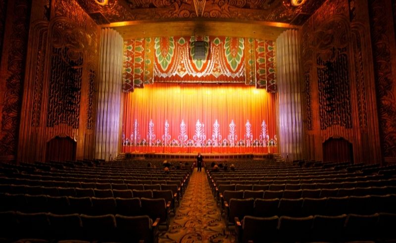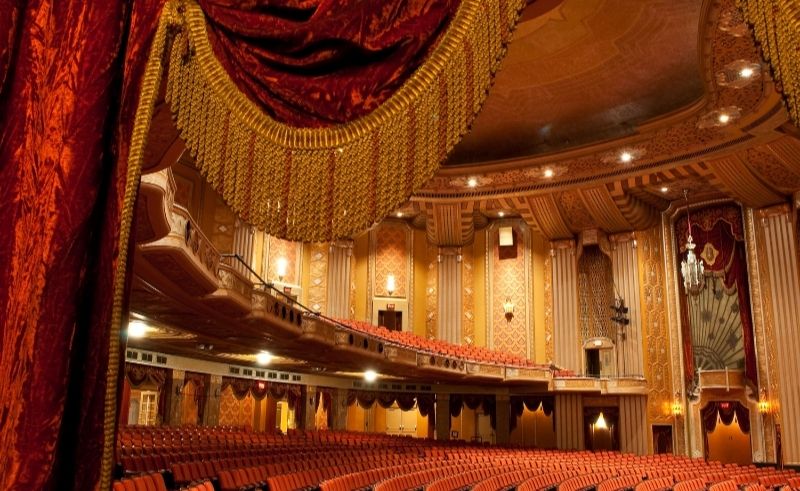 With an interior that acts as a kindred to the Paramount Theatre, the Warner combines Art Deco and French Renaissance style for a truly unique yet classic feel. Designed by the Rapp & Rapp Company based out of Chicago, the facade is simple but effective at drawing attention. Its geometric tiling complemented by gold gilding and showboating neon lights pull your eyes in every direction. Use of luxurious materials, such as solid bronze for the ticketing booths, speak to the magnificence ancient Egypt. The enchanting exterior is contrasted with the elaborate interior, where gold coating spotlights a grand staircase, and bronze banisters lead through an archway of marble, gold accents, and antique drapery. Its features treat the theatre as a modern temple of entertainment, where artistry and the divine intersect.