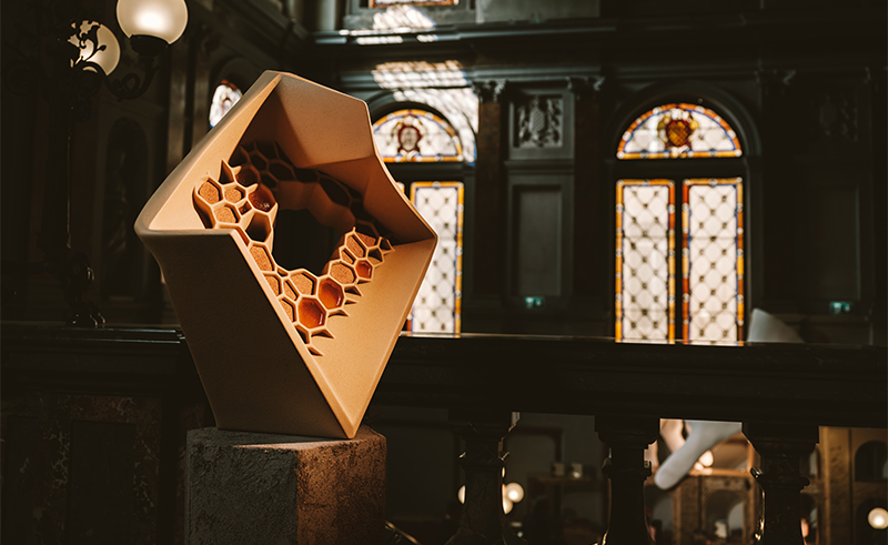 A sculptural fragrance installation that translates the honeycomb's geometric precision into a sensory mix of honeyed florals, mineral warmth, and raw woody structure.
