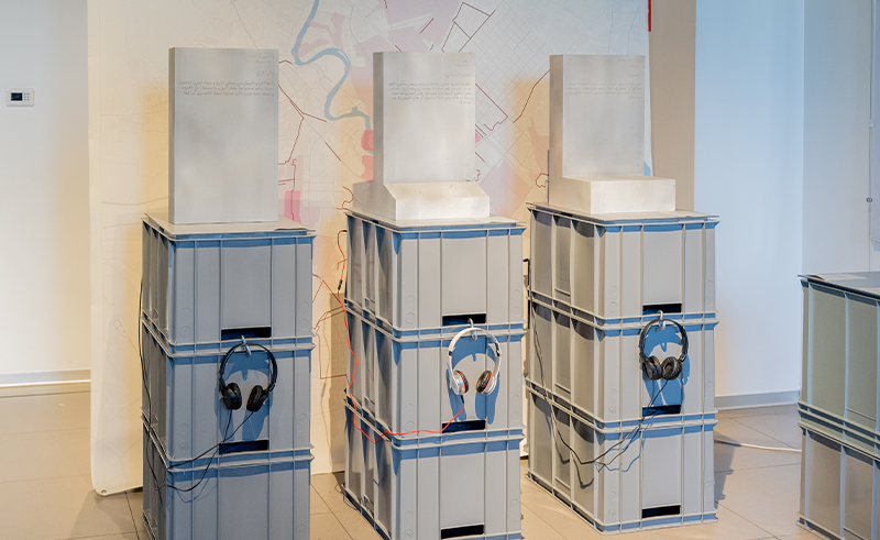 Walls of Remembrance by Ola Znad is inspired by post-2003 Baghdad walls. Three engraved concrete structures carry layered references to childhood, fading rituals, and Iraqi folklore, translating personal memory into collective resilience.