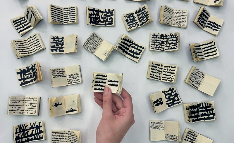 Abutaleb’s parallel explorations on paper sustain her quiet dialogue with writing itself. In 'Book of Diaries' (2022), she documented twenty private reflections, later realizing these pages marked the genesis of her unreadable language. Through 'Transparent Narratives' and 'Unfolding Scripts' (2025), she layered translucent sheets and folded expanses of paper to question how writing behaves in space and how it hides, reveals, or elongates thought. Her 'Miniature Books' condensed that world into fragments small enough to rest in the palm, where intimacy meets scale.