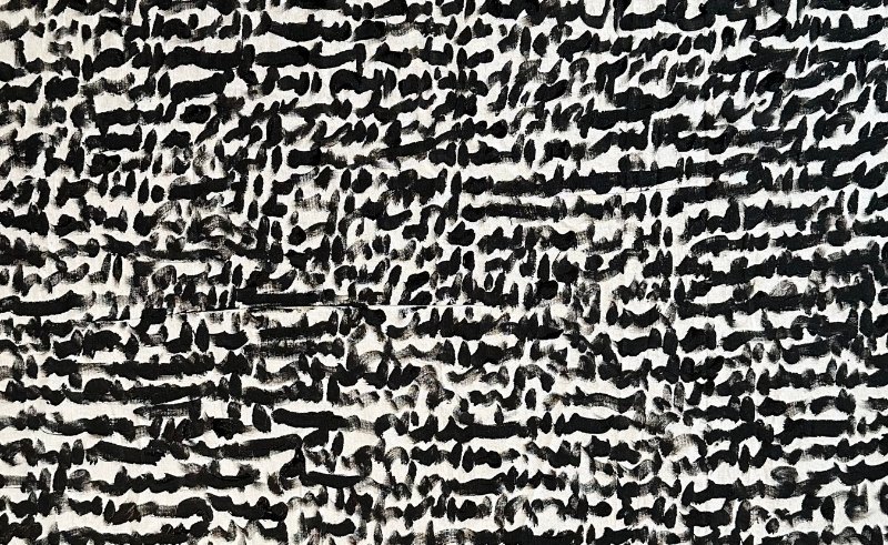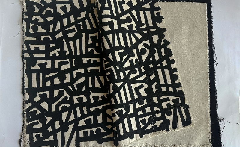 Black ink on white surfaces is her signature, and over the years, her surfaces have expanded from paper to fabric, each responding differently to her gestures. Fabric introduced a new dimension that moved, absorbed, and resisted. “I fell in love with fabric the first time I tested it,” she says. “Every surface reacts differently to ink and brush. Some absorb it deeply, while others let it flow freely across the surface.”