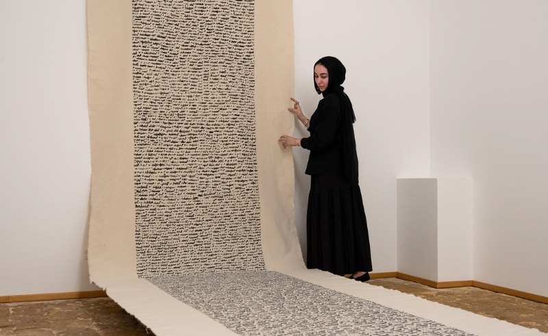 Before her work filled walls and fabric, it lived in her diary. Between lines written only for herself, Mariem Abutaleb began to notice words drifting away from their literal meaning, becoming instead expressions of emotion through movement and pattern. That discovery marked the beginning of her practice.