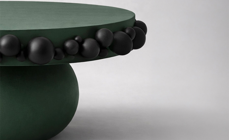 The structure combines turned wood with resin, tinted to match the wood so the surface reads as a single material. The design is brought to life in three finishes: Matcha, a soft green; Dunes, a warm desert-inspired beige; and Black, for a bold, graphic effect.