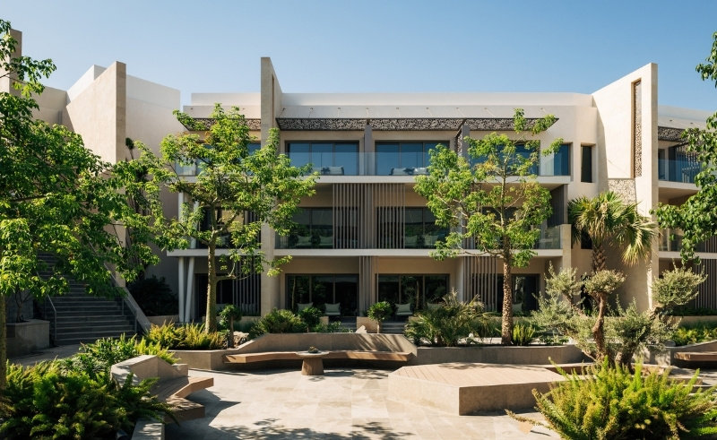 The story of the site began with its landscape: crystalline waters, salt air, and filtered sunlight. The masterplan unfolds as a composition of low-rise, interwoven volumes linked by narrow pathways that invite exploration. Movement through the resort feels discovered rather than designed, an architectural promenade shaped by light and shadow.