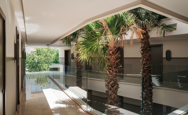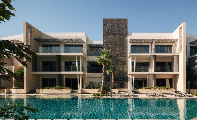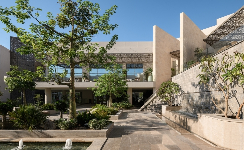 That triad—light, air, water—defines the project’s experiential language. Reflective pools and fountains punctuate the courtyards, animating the architecture with shimmer and sound. Vertical circulation towers reinterpret the region’s historic windcatchers, channeling breezes through the complex. Sunlight filters through contemporary mashrabiyas whose geometric patterns, abstracted from mangrove silhouettes, cast a dynamic play of shadow that changes from dawn to dusk.