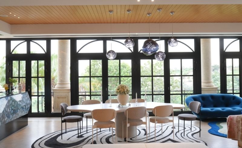 The dining area is organised around an organically shaped table that defines the design direction of the entire zone, with the view beyond becoming part of the composition. An organic carpet from Kahhal 1871 mirrors the table’s form and completes the setting. “I was jumping in happiness when I found this carpet, it brought the whole place together,” Mariam says.