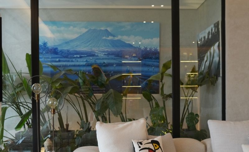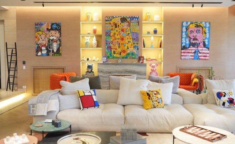 From the entrance, the cues are deliberate. A mirror by Alain Gilles sits at the threshold, paired with a scented candle that shapes an understated transition from the turmoil of city life to the calm of being welcomed into one’s home through all the senses. Nearby, a playful Tom and Jerry artwork sets a lighter tone, acknowledging the presence of children, noise, and the reality of a family home.