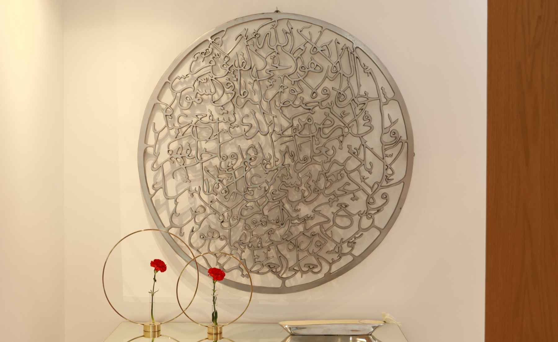 The architecture leans rigid, almost overly square. So she works against that condition with a clear, recurring language. As she points out the Ayet el-Korsi artwork, which reads almost like a circle, she explains that this is not an isolated choice. The circle is an element that returns throughout the house, in artworks, mirrors, and floor lamps.