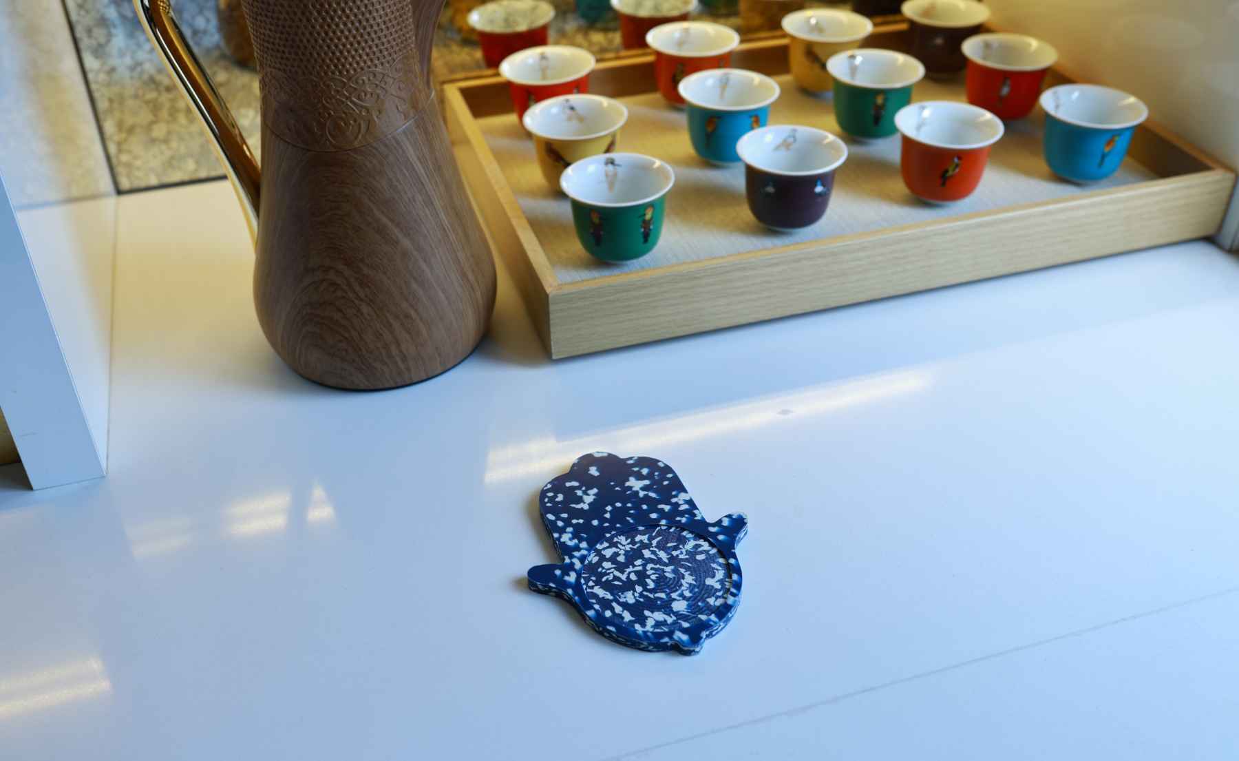 The seating arrangement turns inward. No focal point, no screen anchoring the room. Instead, the furniture gathers loosely. “I added an extra sofa to create a bigger circle where we can sit, talk, and entertain,” she explains. Objects enter in measured intervals. A 'Hand of Fatma' table called 'The Odd Piece' from her collection sits low, its surface reinterpreted through colour alone. “I focused only on changing the colour,” she notes, leaving the form’s symbolism untouched.