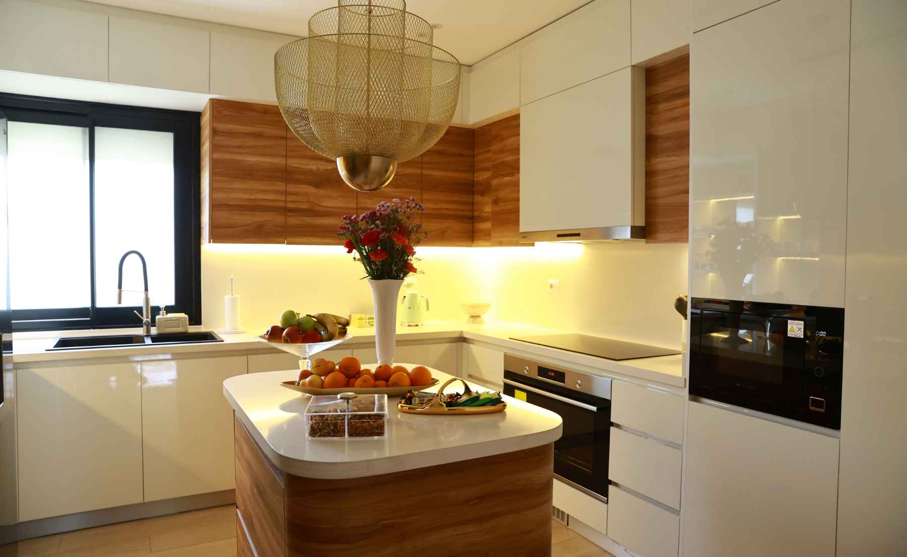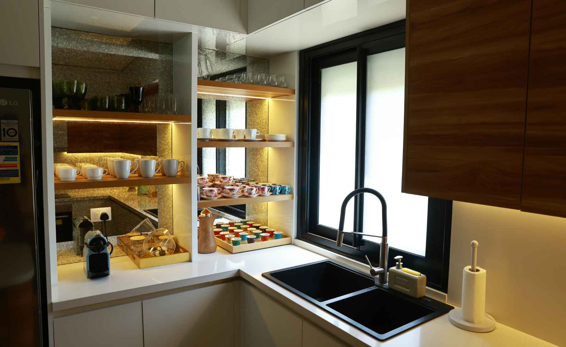 The kitchen continues the same discipline in light, neutral, pared-back tones. A chandelier marks the centre of the space, balanced by the island below it. “I usually prefer white kitchens and neutral tones. The pop of colour comes from food,” she says. Function carries the accent. Storage is treated as part of the composition. Glassware is kept in sight rather than hidden behind doors, and the antique mirror extends the room visually.