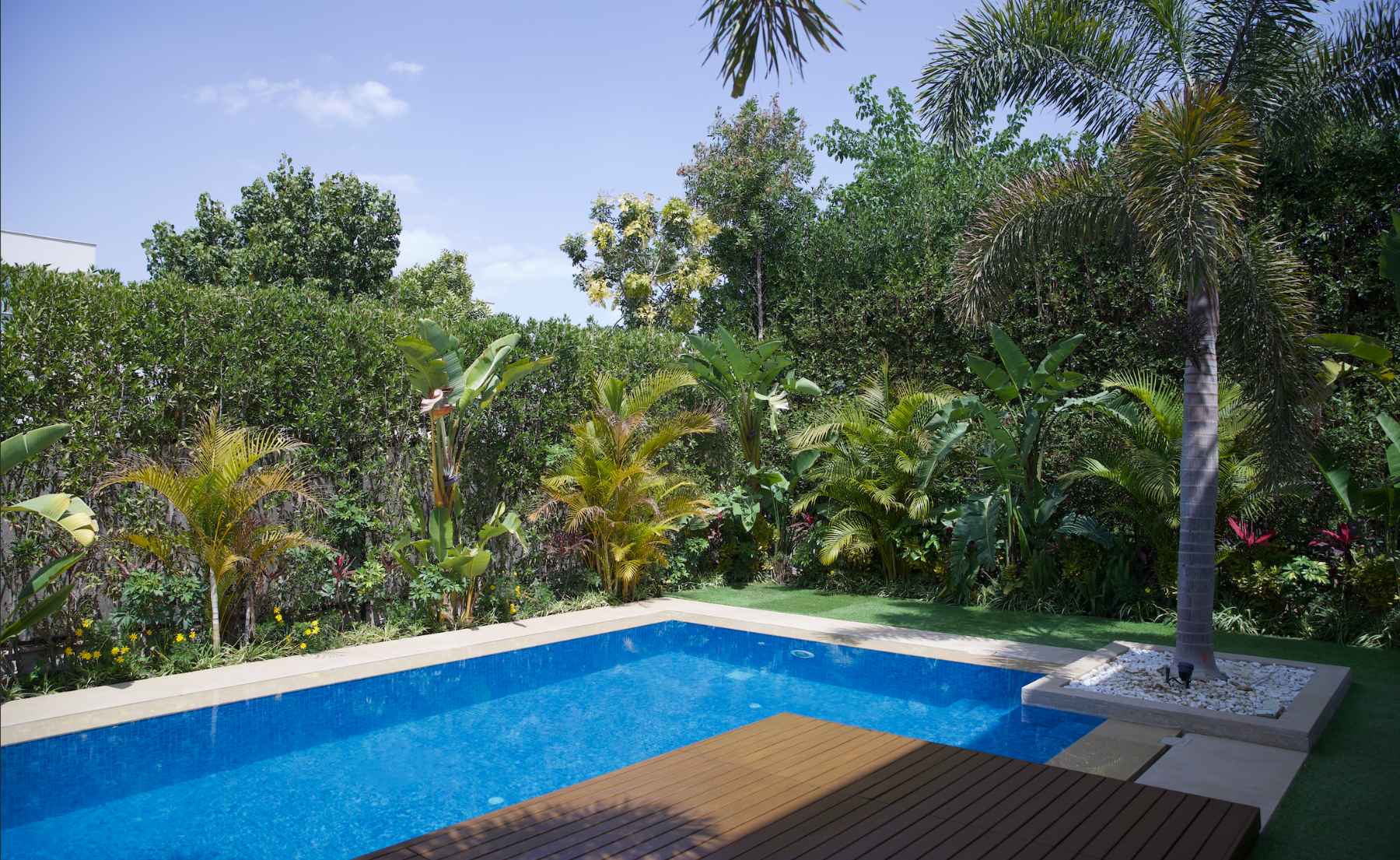 Beyond the interior, the house opens into a slower rhythm. The garden extends the layout outward, with the pool framed by foxtail palms and layered with Erica and banana leaf trees. The structure becomes looser without losing the same calm personality. At its centre stands an olive tree older than the house itself. “I think it’s around 25 years old,” she says. It is kept as it is, unstyled and unframed. “We leave it for the next people, the next generation.” A sense of continuity and blessing, carried forward.