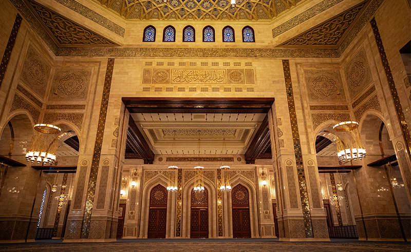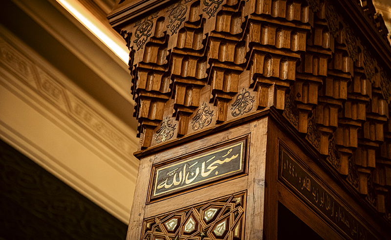 At its heart, the main prayer hall sits beneath a dominant central dome. A vast chandelier hovers over the prayer hall, its circular form mirrors the geometry of the dome and anchors the space with a soft, diffused glow. The wooden minbar introduces texture and warmth, offering a human-scale counterpoint to the surrounding expanse and grounding the experience in material presence. The transition from the open courtyards to the enclosed interior is marked by a change in light and acoustics, creating a sense of pause before entering the core of the mosque, drawing the surrounding landscape inward and upward.