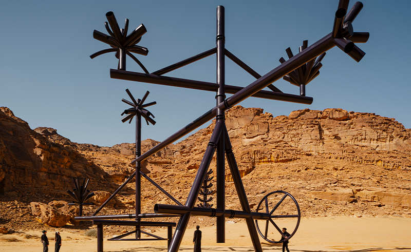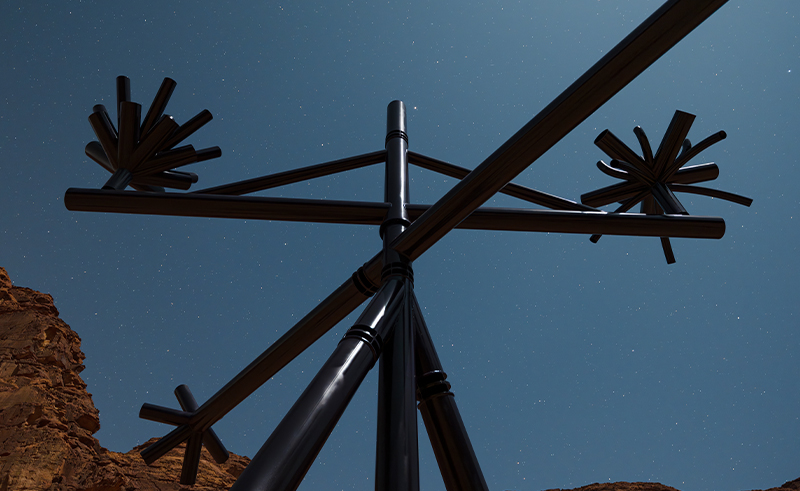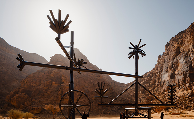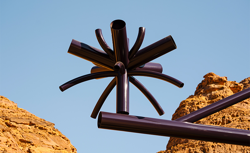 From these observations emerged 'Bloom', a large-scale kinetic installation presented at Desert X AlUla in 2026. The piece responds to wind, light, and shadow, its aluminium tubes echoing the shapes of rock formations and local flora without replicating them. Movement became central to the work: subtle shifts in the sculpture interact with sunlight and airflow, creating a dialogue between stillness and motion that mirrors the desert’s rhythms. Shadows, cast across the sand, layer the landscape and sculpture together, emphasising the perceptual experience of the site.