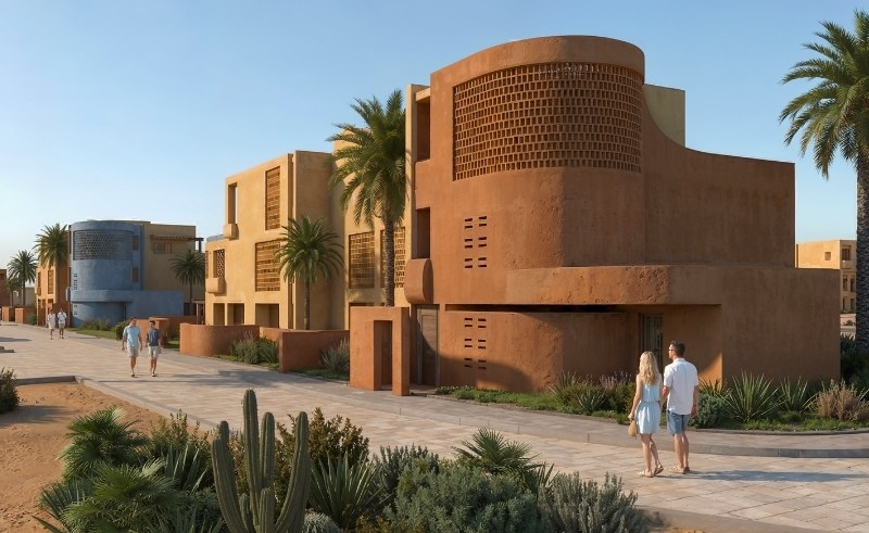 Inspired by Nubian design the domes, soft curves, and sandy tones are repeated across the site, establishing a cohesive visual language that draws on collective memory while adapting it to a coastal context.